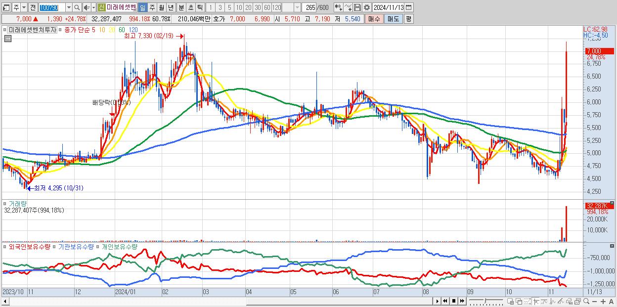 - 미래에셋벤처투자 (7,000원 ▲ 24.78% , 시총: 3,719억, 거래량: 32,287,407, 거래대금:2,100억)