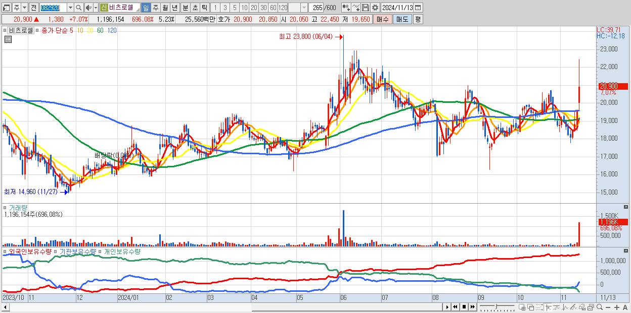 - 비츠로셀 (20,900원 ▲ 7.07% , 시총: 4,780억, 거래량: 1,196,154, 거래대금:256억)