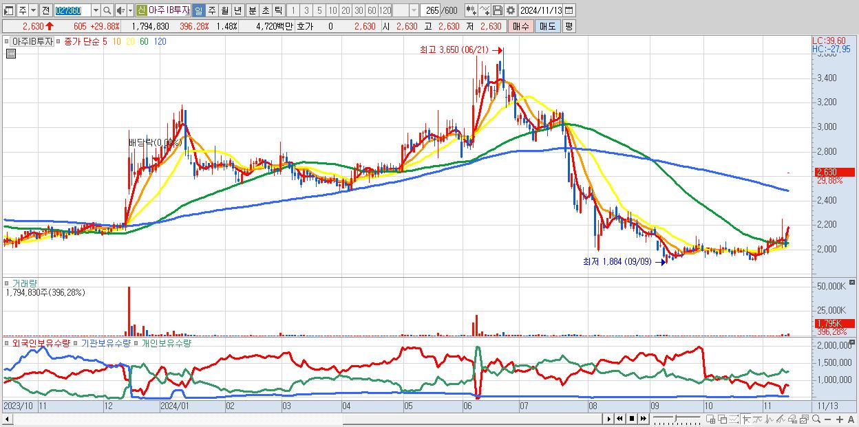 - 아주IB투자 (2,630원 ▲ 29.88% , 시총: 3,181억, 거래량: 1,794,830, 거래대금:47억)