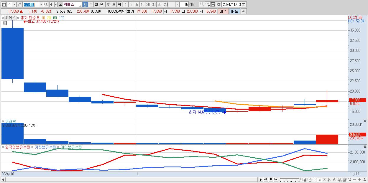 - 씨메스 (17,850원 ▲ 6.82% , 시총: 2,042억, 거래량: 9,559,926, 거래대금:1,809억)