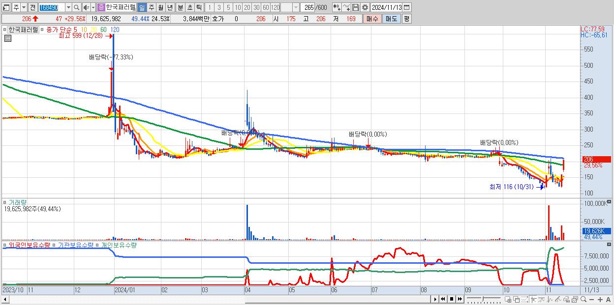 - 한국패러랠 (206원 ▲ 29.56% , 시총: 165억, 거래량: 19,625,982, 거래대금:38억)