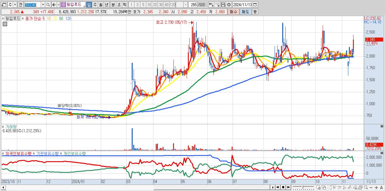 - 윙입푸드 (2,345원 ▲ 17.48% , 시총: 1,125억, 거래량: 8,428,983, 거래대금:193억)