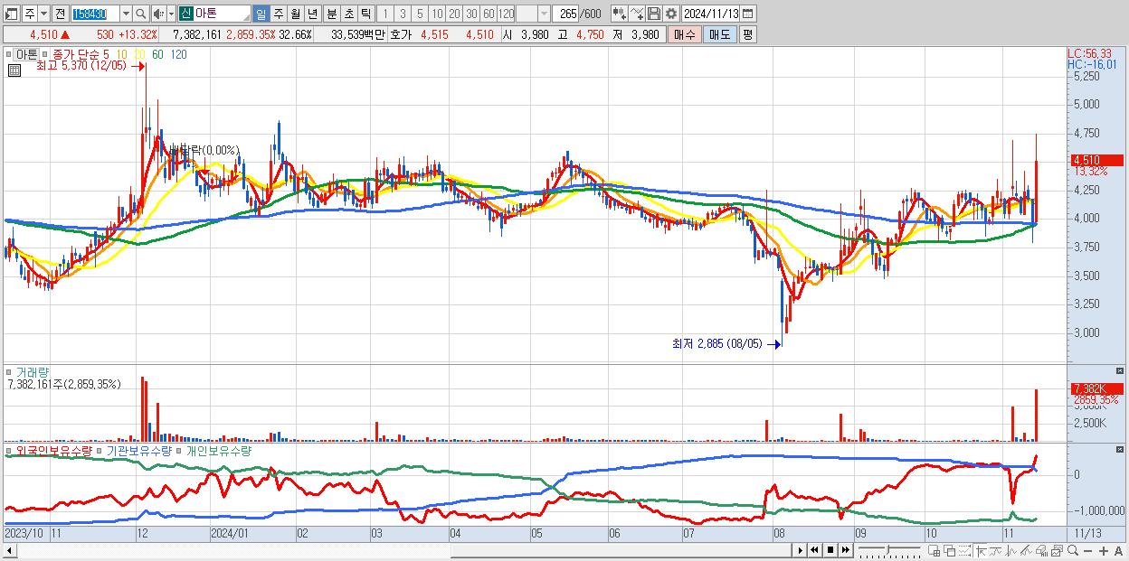 - 아톤 (4,510원 ▲ 13.32% , 시총: 1,019억, 거래량: 7,382,161, 거래대금:335억)