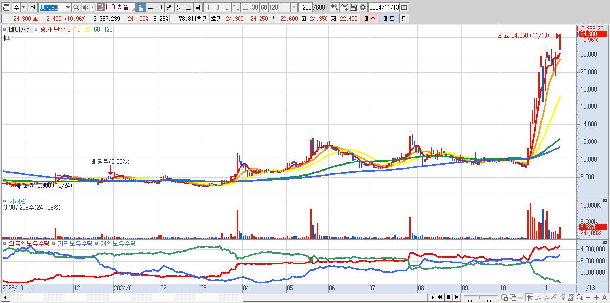 - 네이처셀 (24,300원 ▲ 10.96% , 시총: 15,639억, 거래량: 3,387,239, 거래대금:788억)