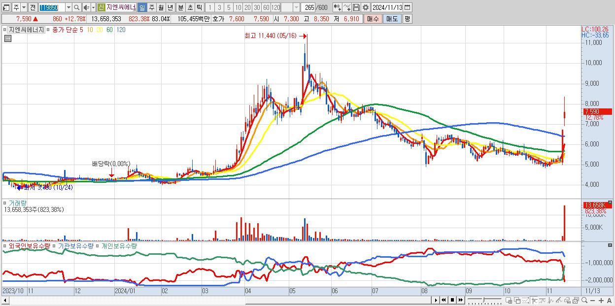 - 지엔씨에너지 (7,590원 ▲ 12.78% , 시총: 1,248억, 거래량: 13,658,353, 거래대금:1,055억)