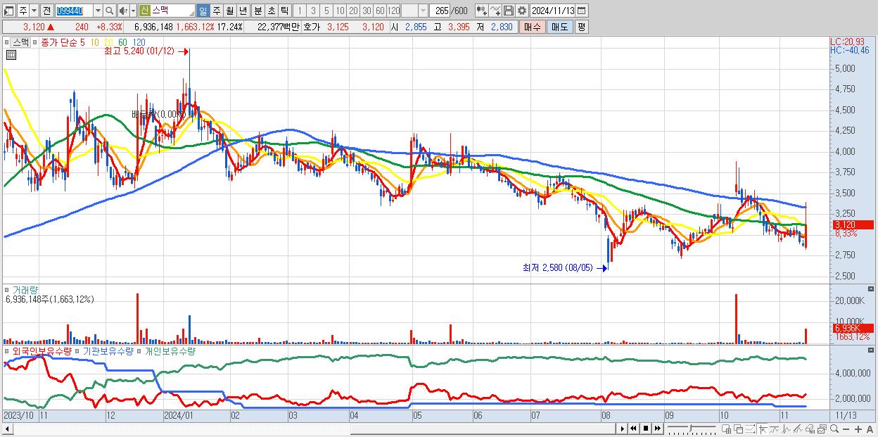 - 스맥 (3,120원 ▲ 8.33% , 시총: 1,256억, 거래량: 6,936,148, 거래대금:224억)