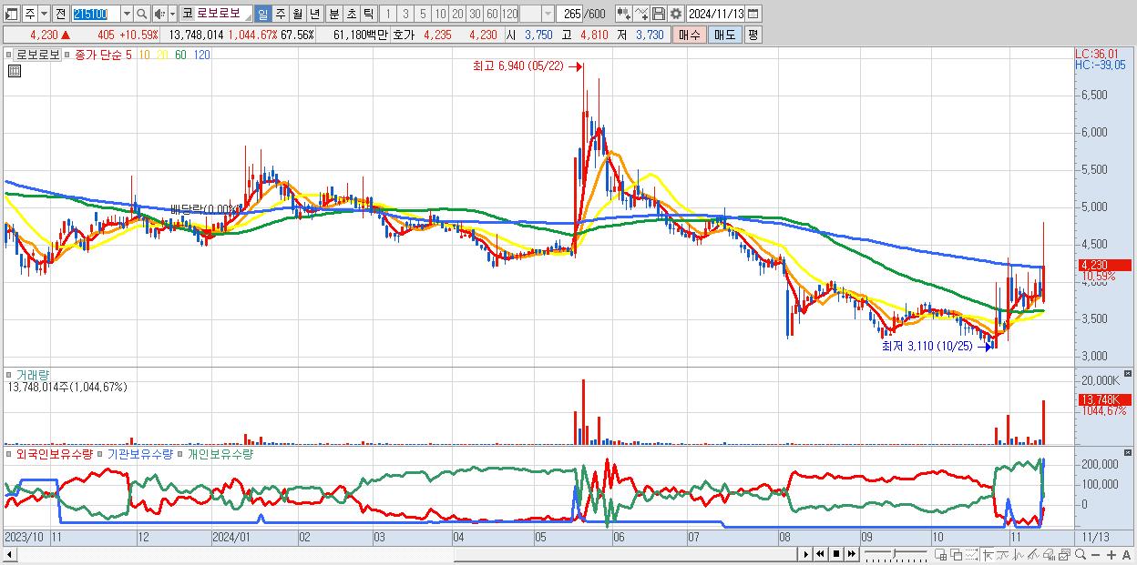 - 로보로보 (4,230원 ▲ 10.59% , 시총: 861억, 거래량: 13,748,014, 거래대금:612억)
