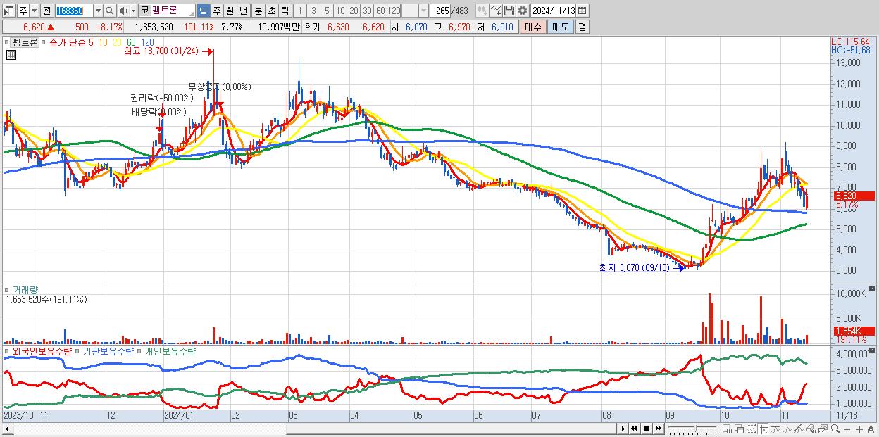 - 펨트론 (6,620원 ▲ 8.17% , 시총: 1,409억, 거래량: 1,653,520, 거래대금:110억)