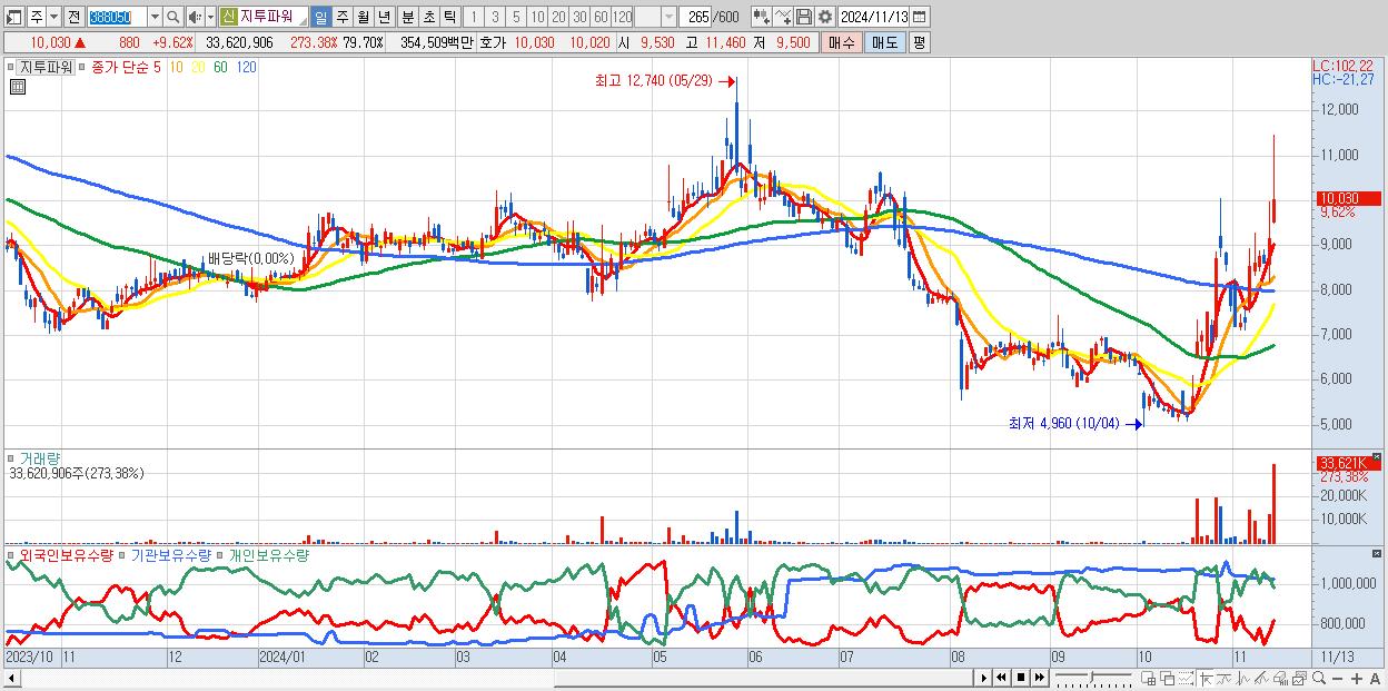 - 지투파워 (10,030원 ▲ 9.62% , 시총: 1,877억, 거래량: 33,620,906, 거래대금:3,545억)