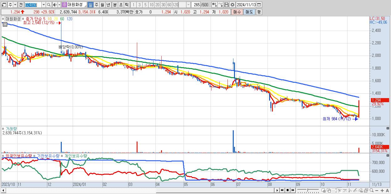 - 대원화성 (1,294원 ▲ 29.92% , 시총: 534억, 거래량: 2,639,744, 거래대금:34억)