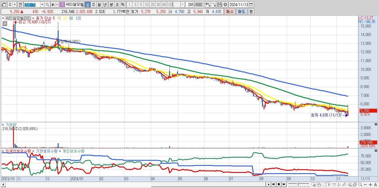 - 씨티알모빌리티 (5,250원 ▲ 8.92% , 시총: 452억, 거래량: 216,546, 거래대금:12억)