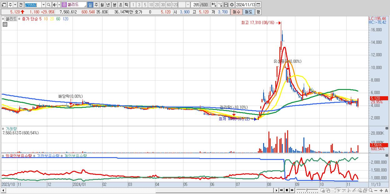 - 셀리드 (5,120원 ▲ 29.95% , 시총: 1,080억, 거래량: 7,560,612, 거래대금:361억)