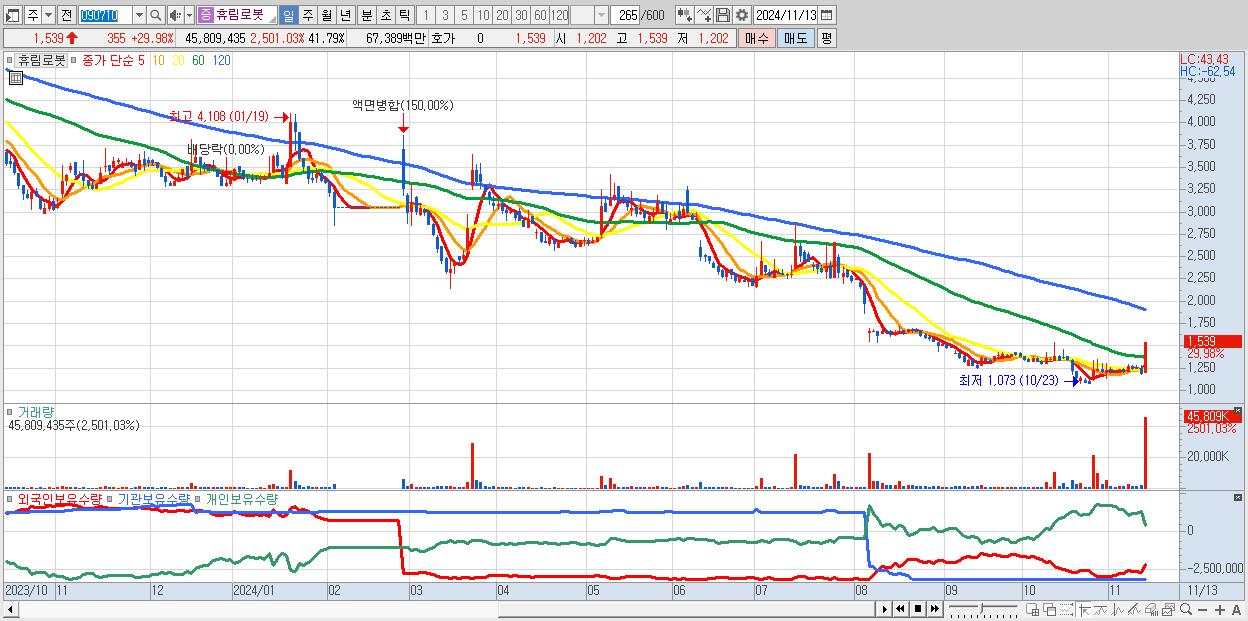 - 휴림로봇 (1,539원 ▲ 29.98% , 시총: 1,687억, 거래량: 45,809,435, 거래대금:674억)