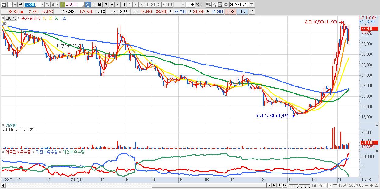 - 디어유 (38,600원 ▲ 7.07% , 시총: 9,163억, 거래량: 735,864, 거래대금:281억)