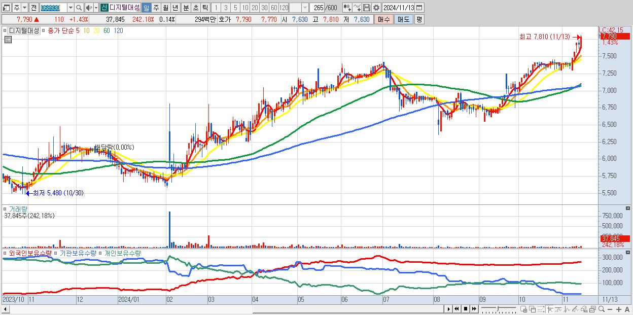 - 디지털대성 (7,790원 ▲ 1.43% , 시총: 2,156억, 거래량: 37,845, 거래대금:3억, KOSDAQ)