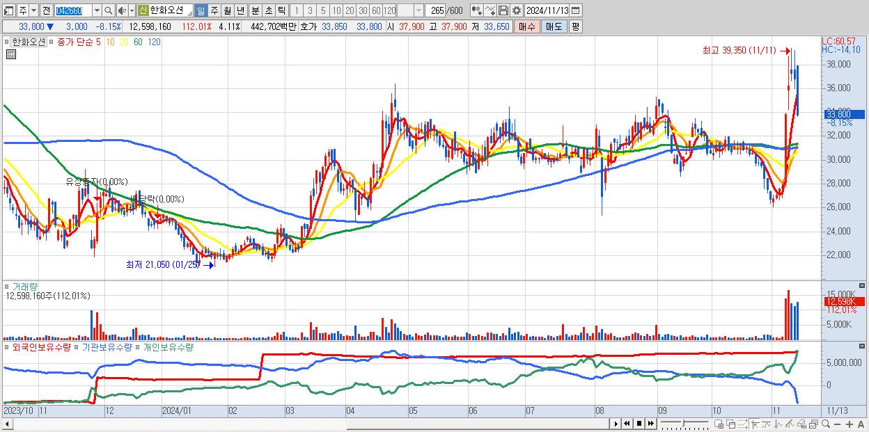 - 한화오션 (33,800원 ▼ -8.15% , 시총: 103,568억, 거래량: 12,598,160, 거래대금:4,427억)