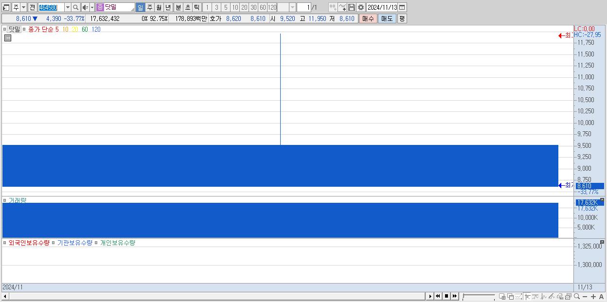 - 닷밀 (8,610원 ▼ -33.77% , 시총: 788억, 거래량: 17,632,432, 거래대금:1,789억)