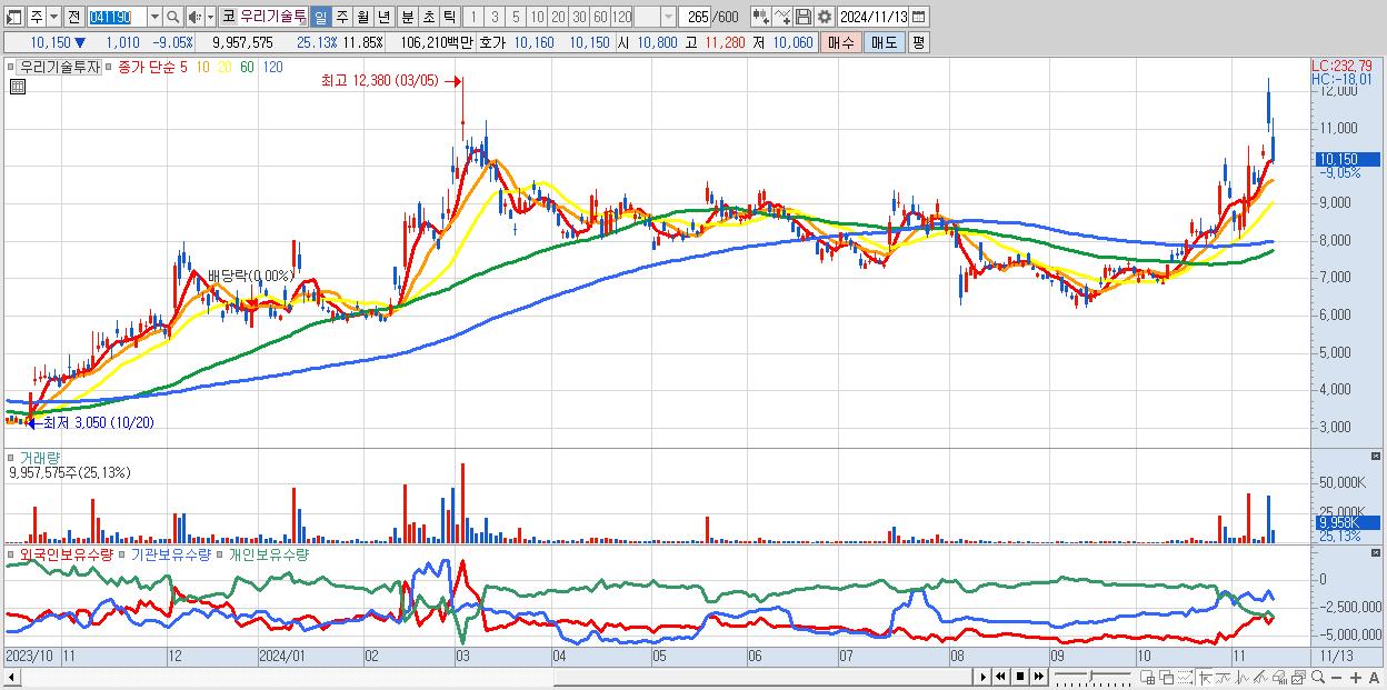 - 우리기술투자 (10,150원 ▼ -9.05% , 시총: 8,526억, 거래량: 9,957,575, 거래대금:1,062억)