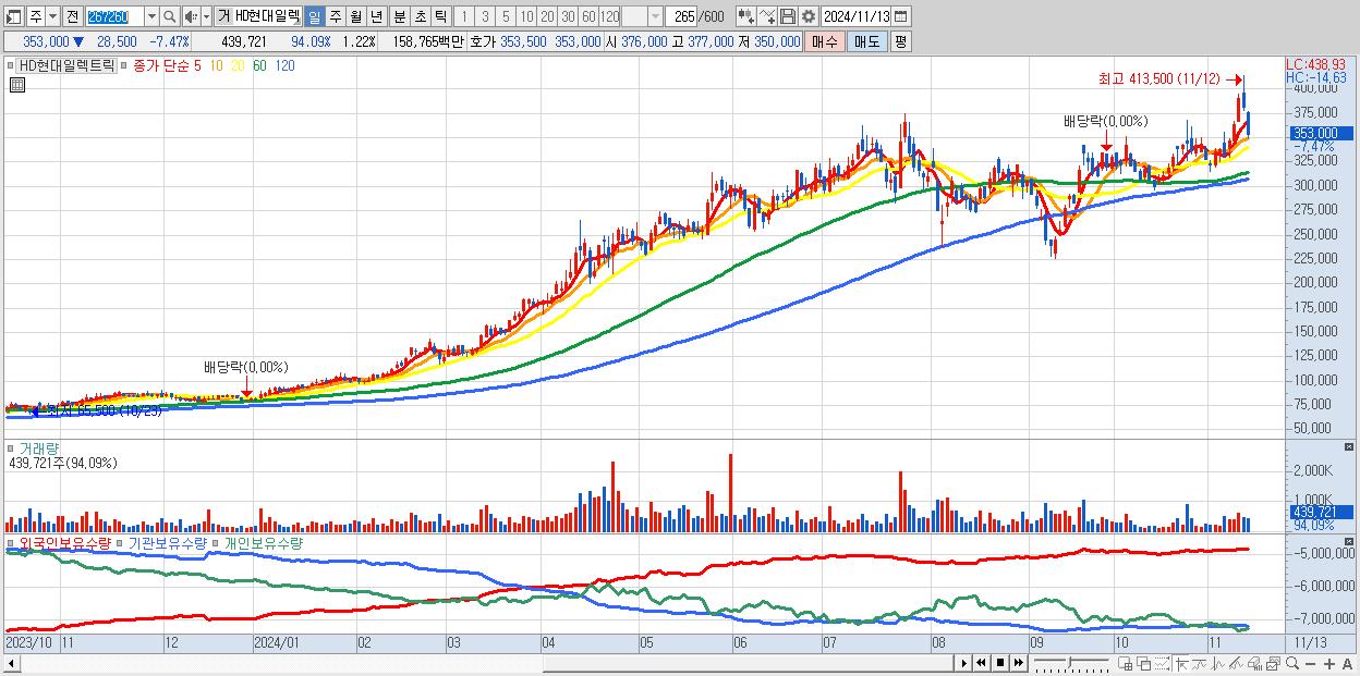 - HD현대일렉트릭 (353,000원 ▼ -7.47% , 시총: 127,246억, 거래량: 439,721, 거래대금:1,588억)