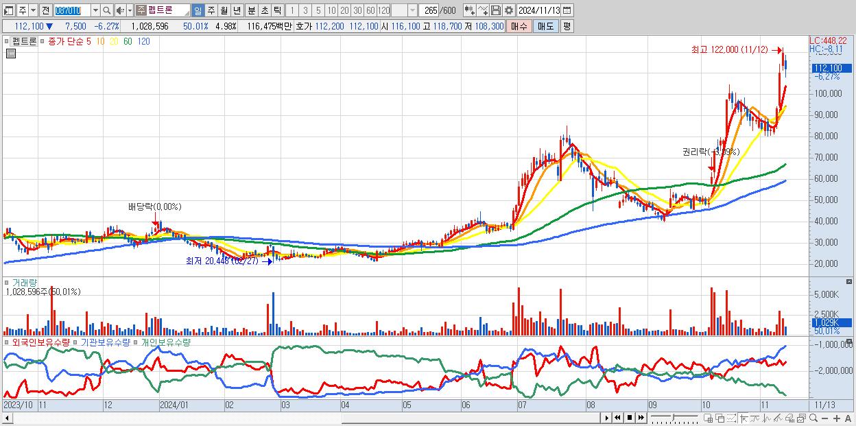 - 펩트론 (112,100원 ▼ -6.27% , 시총: 23,157억, 거래량: 1,028,596, 거래대금:1,165억)