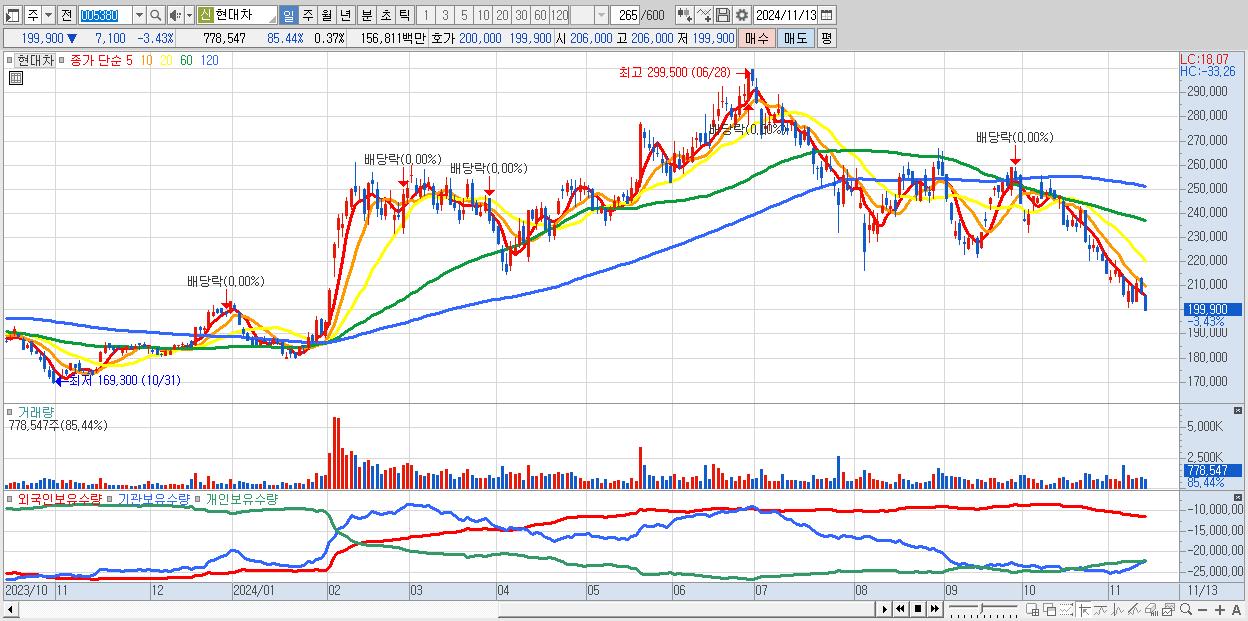 - 현대차 (199,900원 ▼ -3.43% , 시총: 418,623억, 거래량: 778,547, 거래대금:1,568억)