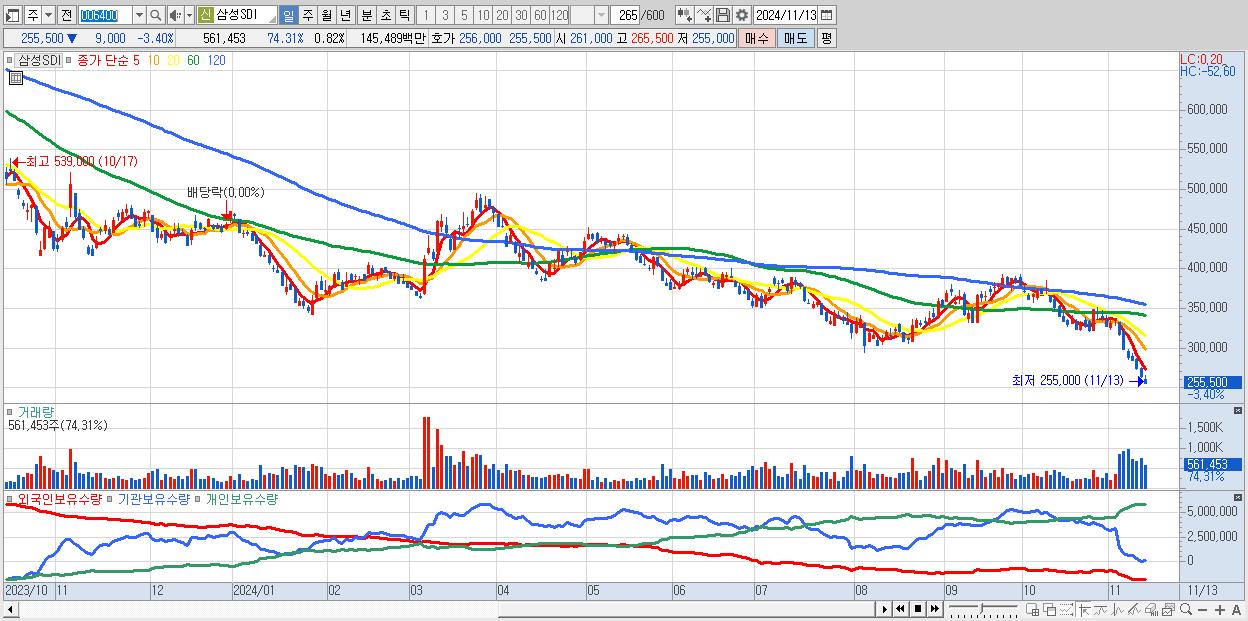 - 삼성SDI (255,500원 ▼ -3.4% , 시총: 175,693억, 거래량: 561,453, 거래대금:1,455억)