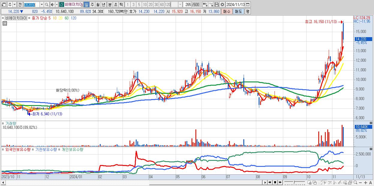 - 비에이치아이 (14,220원 ▼ -5.45% , 시총: 4,400억, 거래량: 10,640,100, 거래대금:1,607억)