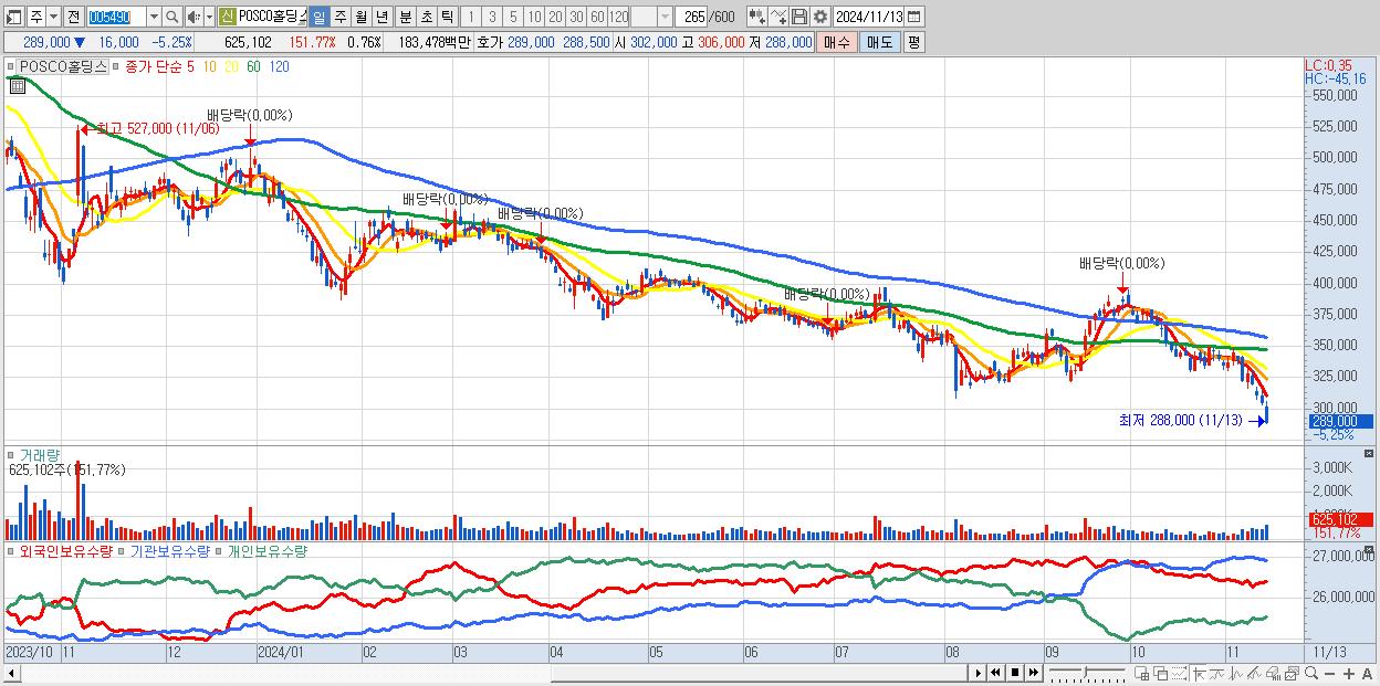 - POSCO홀딩스 (289,000원 ▼ -5.25% , 시총: 238,784억, 거래량: 625,102, 거래대금:1,835억)