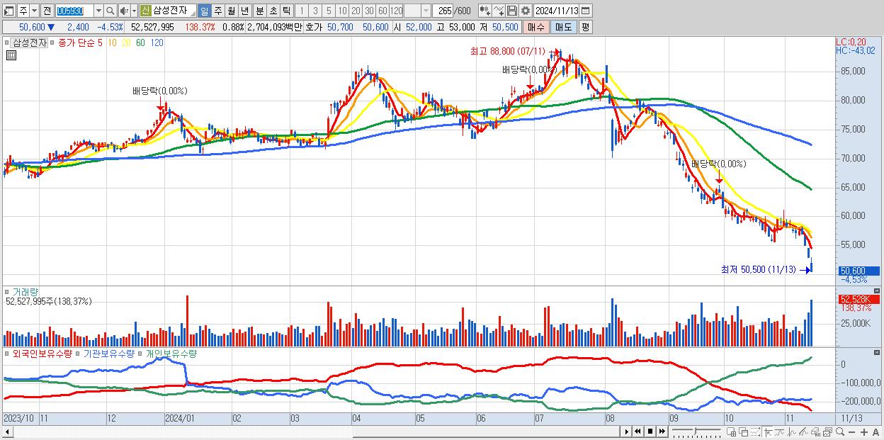 1.삼성전자 50,600원 ▼ -4.53% (KOSPI, 005930)