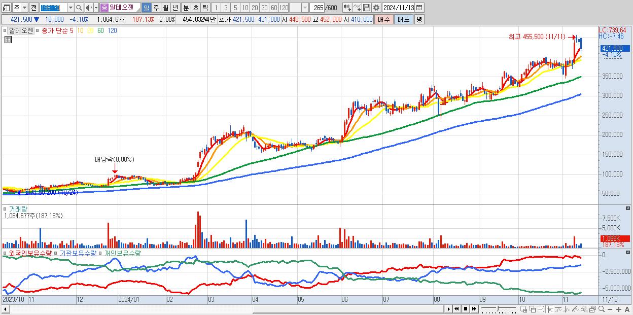 - 알테오젠 (421,500원 ▼ -4.1% , 시총: 224,739억, 거래량: 1,064,677, 거래대금:4,540억)