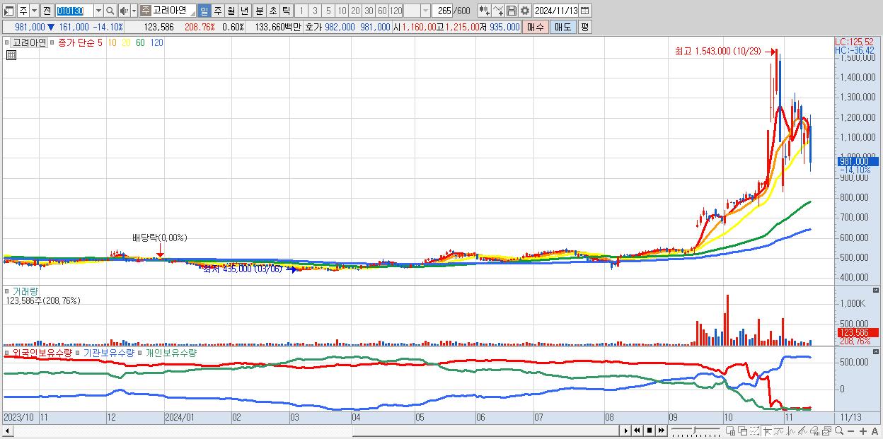 - 고려아연 (981,000원 ▼ -14.1% , 시총: 203,099억, 거래량: 123,586, 거래대금:1,337억)