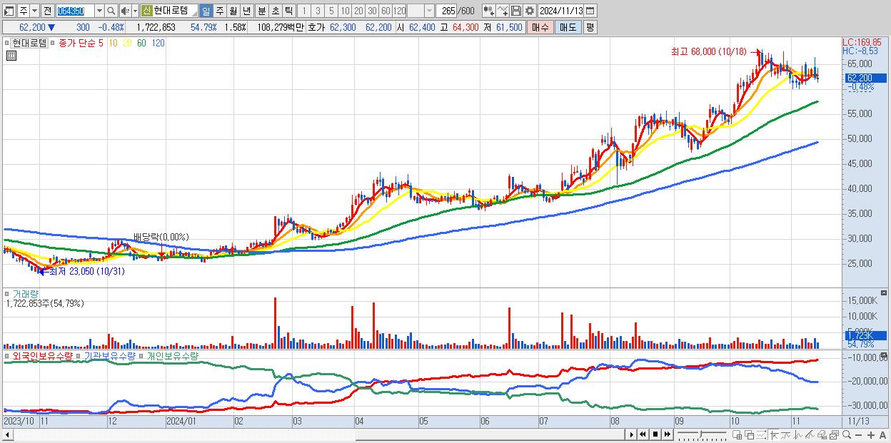 - 현대로템 (62,200원 ▼ -0.48% , 시총: 67,887억, 거래량: 1,722,853, 거래대금:1,083억)