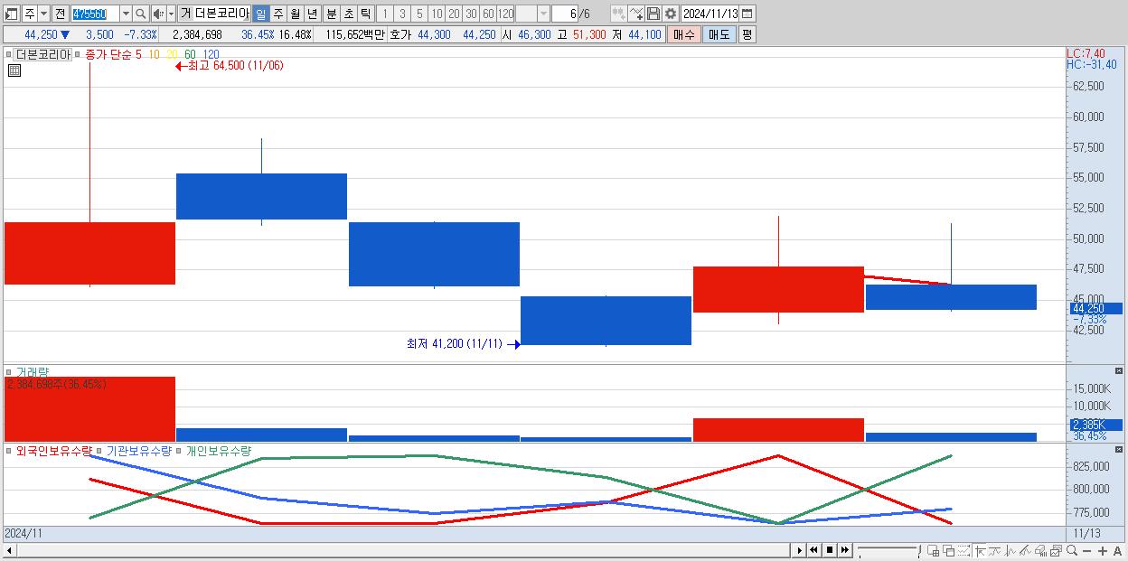 - 더본코리아 (44,250원 ▼ -7.33% , 시총: 6,401억, 거래량: 2,384,698, 거래대금:1,157억)