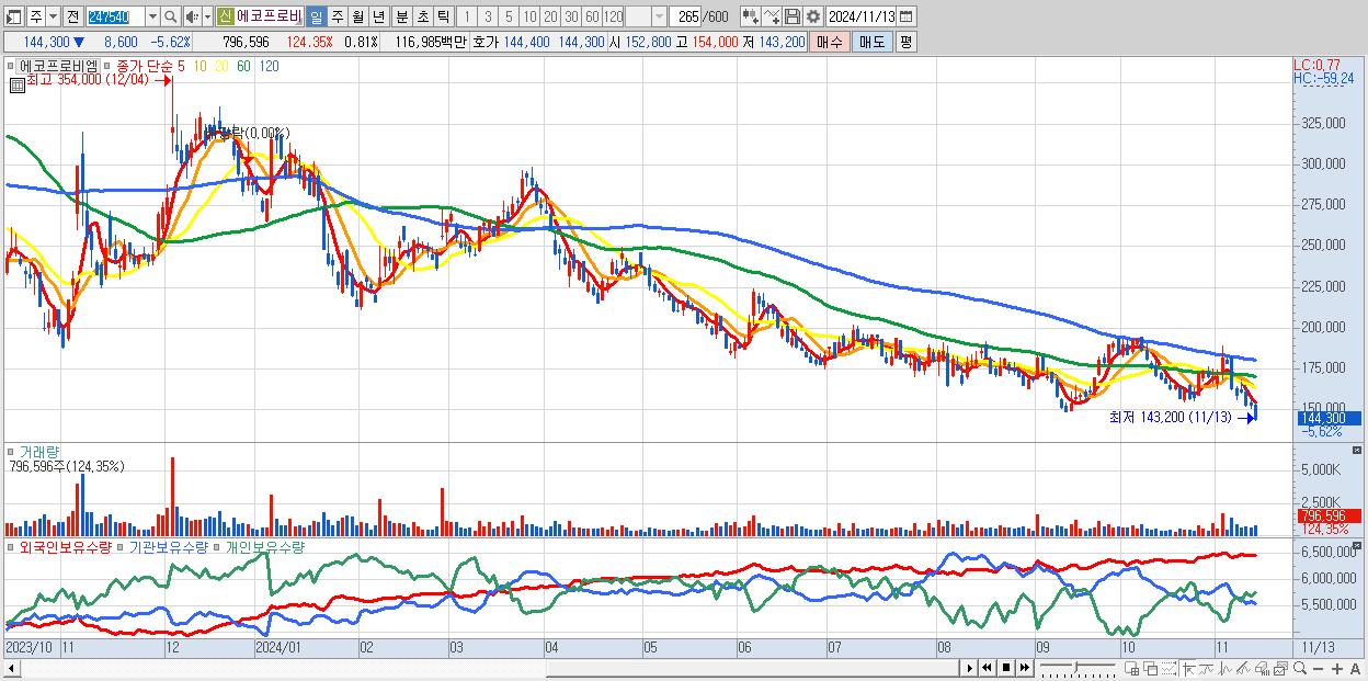 - 에코프로비엠 (144,300원 ▼ -5.62% , 시총: 141,127억, 거래량: 796,596, 거래대금:1,170억)