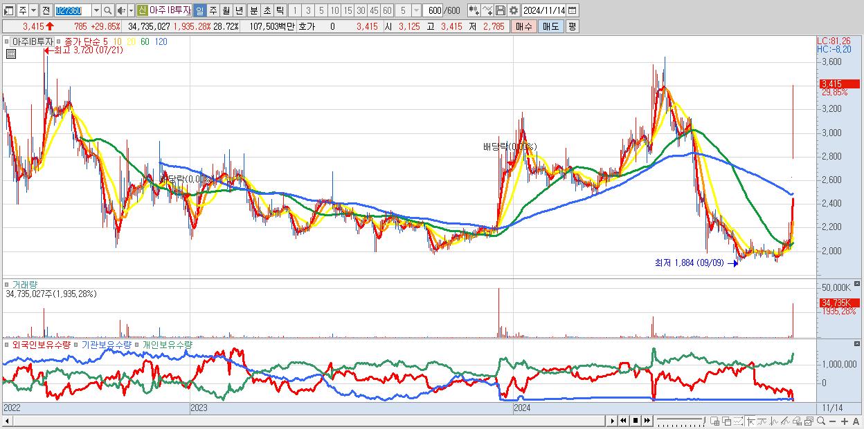- 아주IB투자 (3,415원 ▲ 29.85% , 시총: 4,130억, 거래량: 34,735,027, 거래대금:1,075억)
