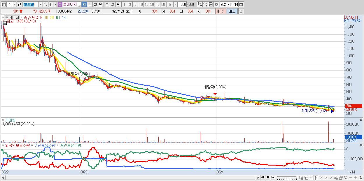 - 썸에이지 (304원 ▲ 29.91% , 시총: 423억, 거래량: 1,083,442, 거래대금:3억)