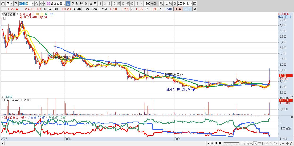 - 일성건설 (1,759원 ▲ 13.12% , 시총: 950억, 거래량: 13,342,540, 거래대금:242억)