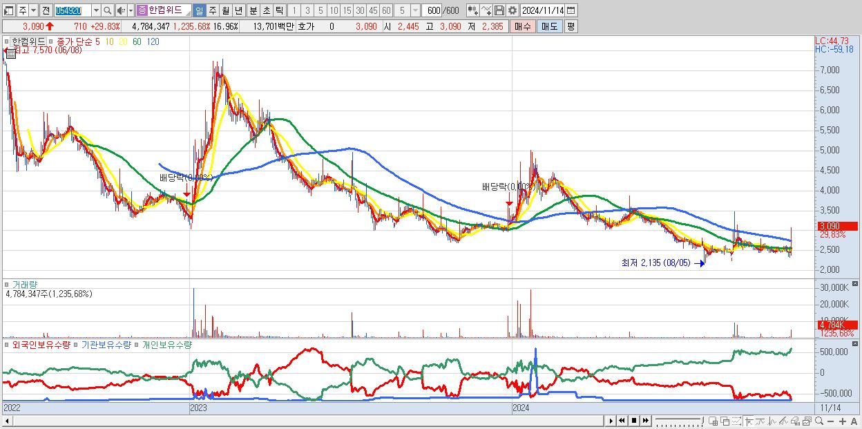 - 한컴위드 (3,090원 ▲ 29.83% , 시총: 872억, 거래량: 4,784,347, 거래대금:137억)