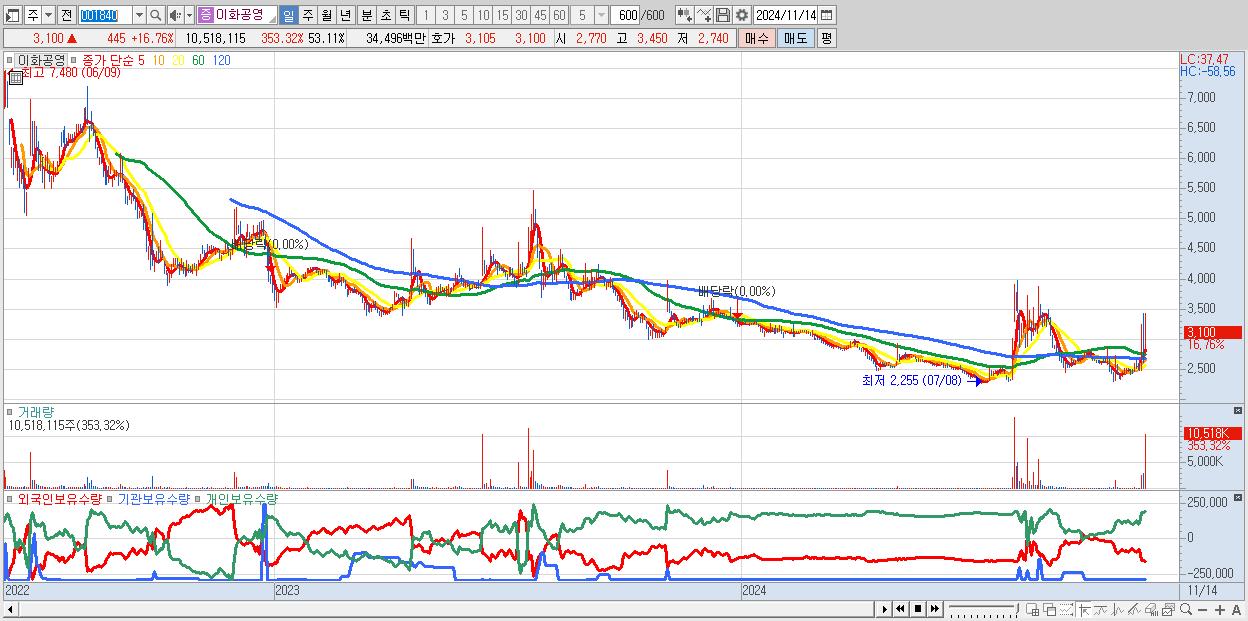 - 이화공영 (3,100원 ▲ 16.76% , 시총: 614억, 거래량: 10,518,115, 거래대금:345억)