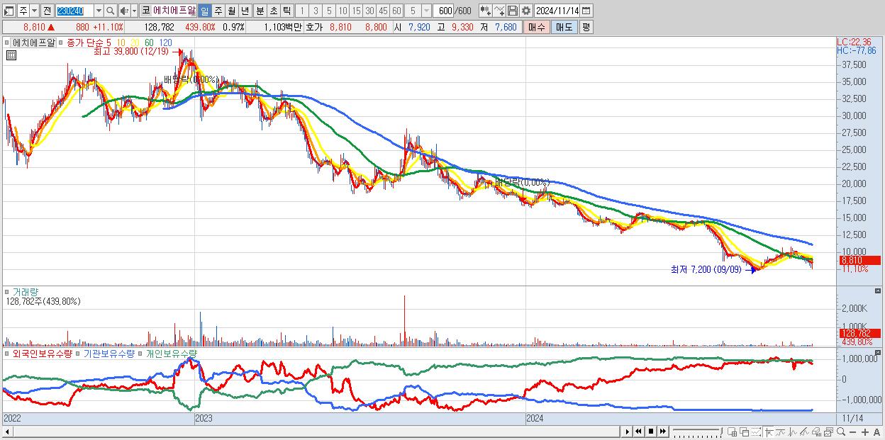 - 에치에프알 (8,810원 ▲ 11.1% , 시총: 1,173억, 거래량: 128,782, 거래대금:11억)