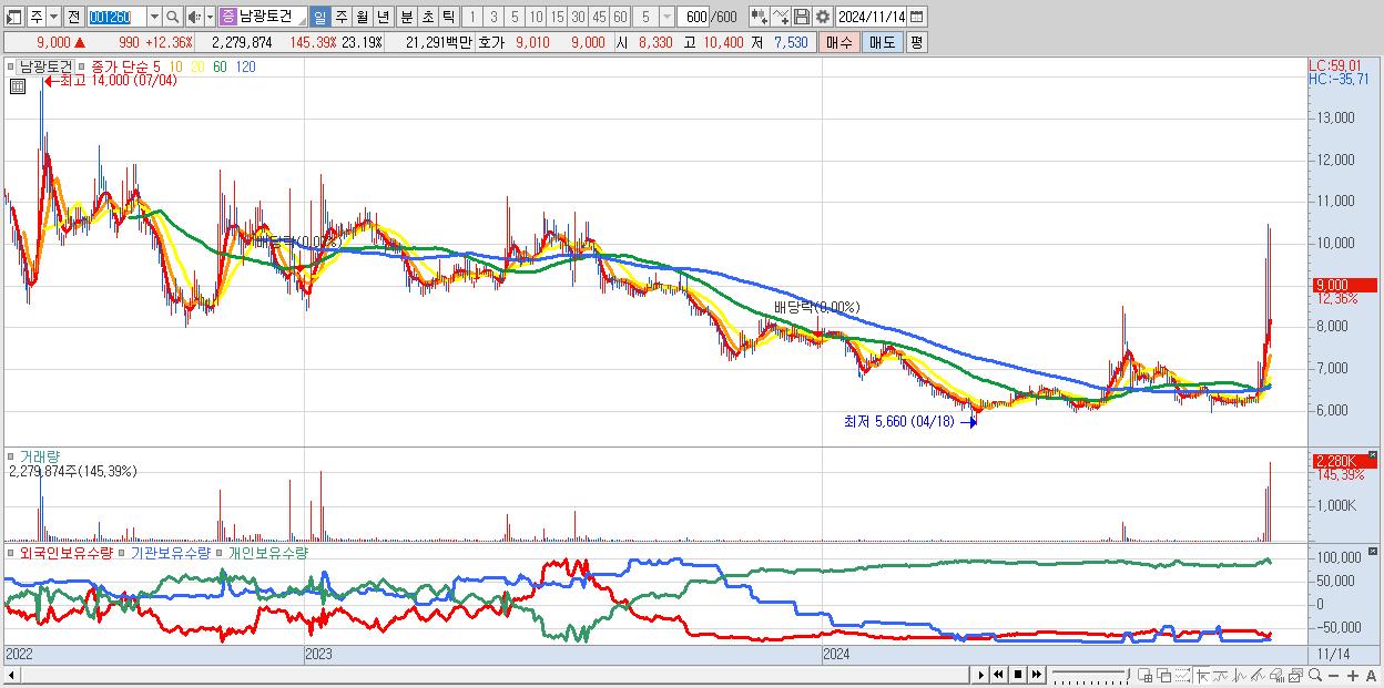 - 남광토건 (9,000원 ▲ 12.36% , 시총: 885억, 거래량: 2,279,874, 거래대금:213억)