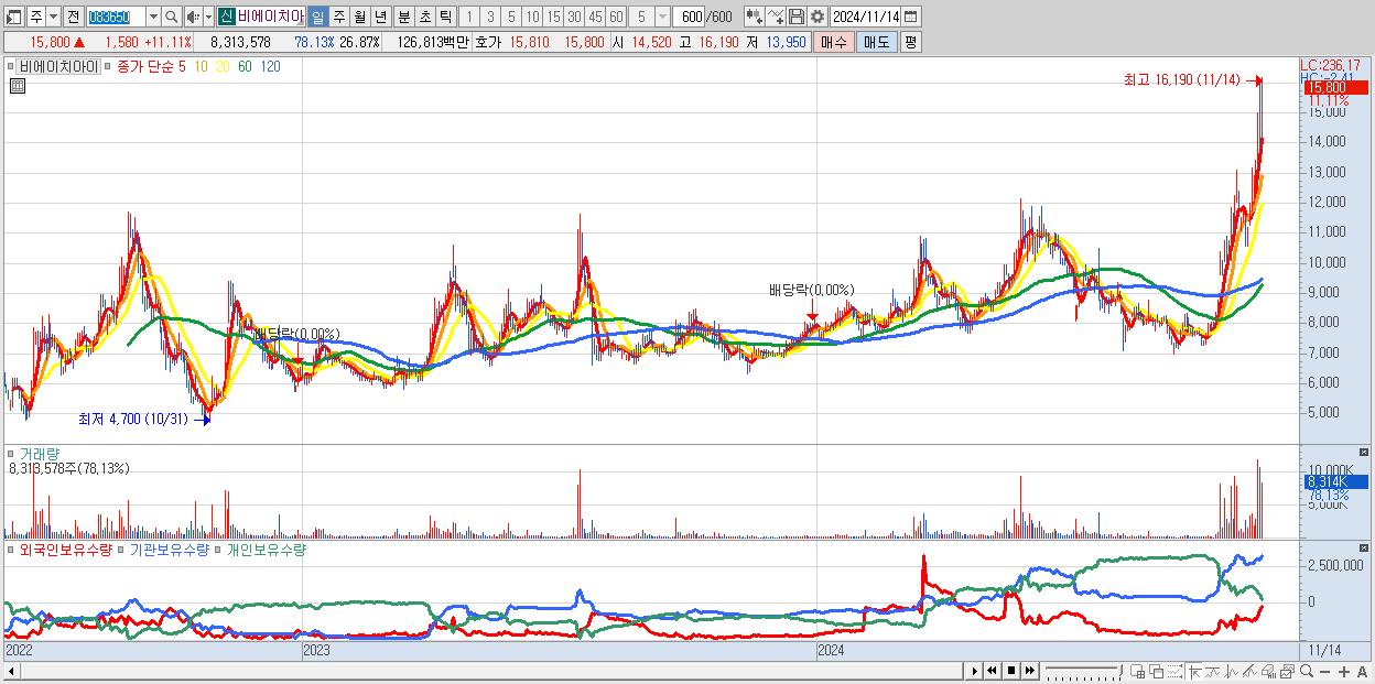 - 비에이치아이 (15,800원 ▲ 11.11% , 시총: 4,889억, 거래량: 8,313,578, 거래대금:1,268억)