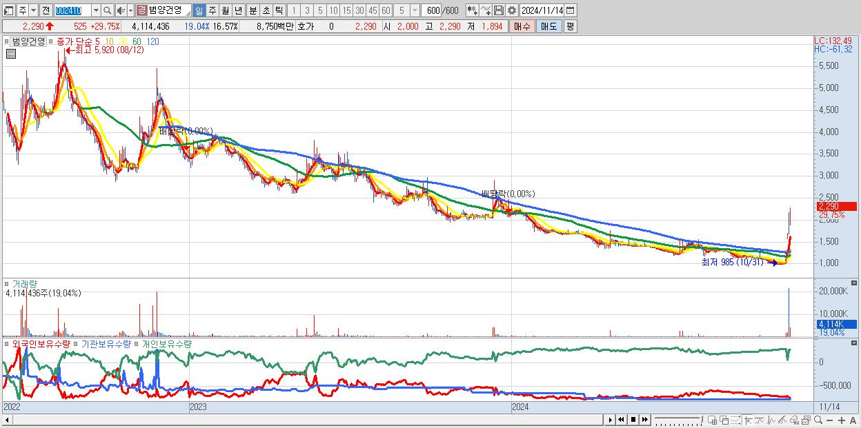- 범양건영 (2,290원 ▲ 29.75% , 시총: 569억, 거래량: 4,114,436, 거래대금:87억)
