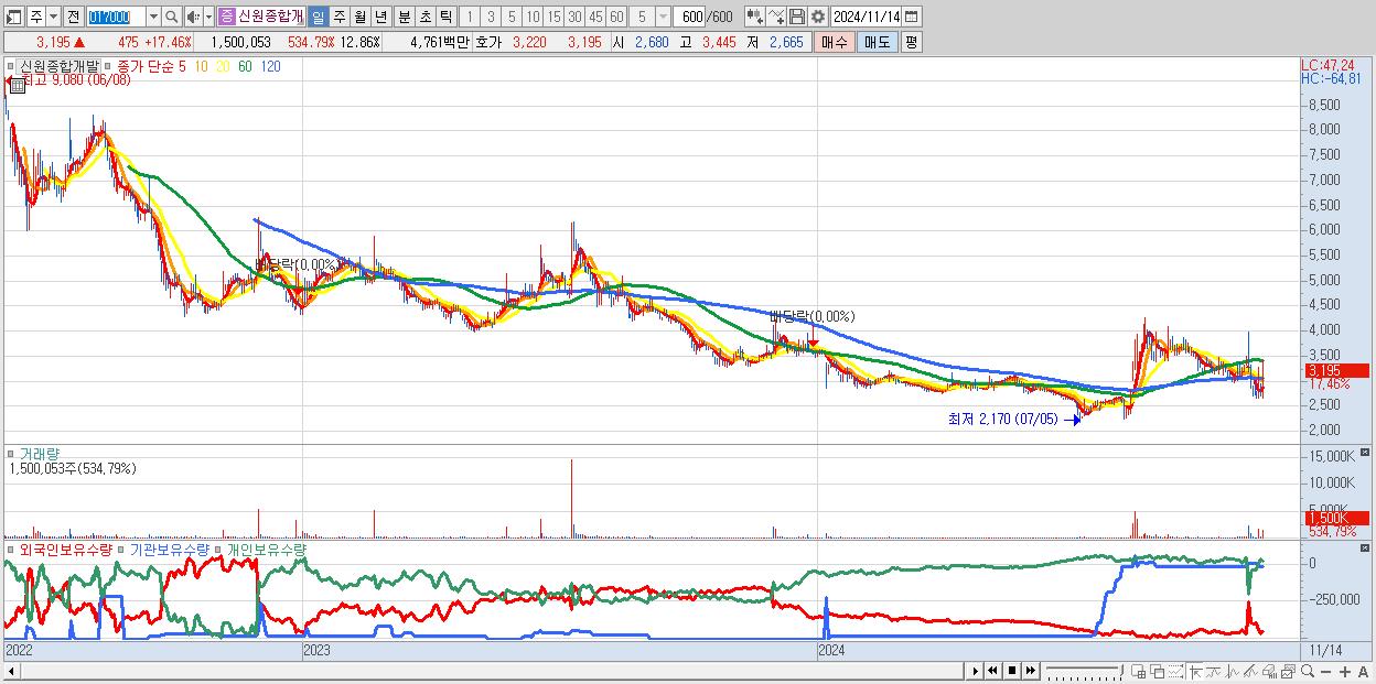 - 신원종합개발 (3,195원 ▲ 17.46% , 시총: 373억, 거래량: 1,500,053, 거래대금:48억)