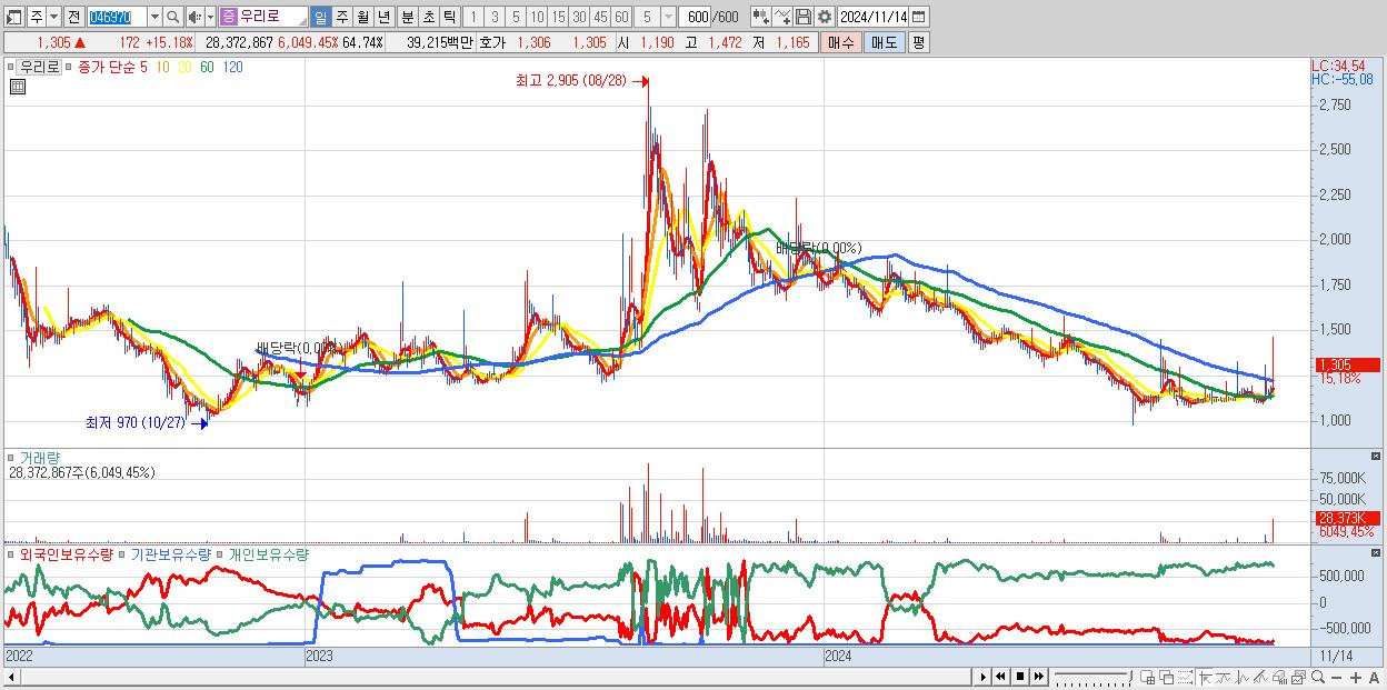- 우리로 (1,305원 ▲ 15.18% , 시총: 572억, 거래량: 28,372,867, 거래대금:392억)