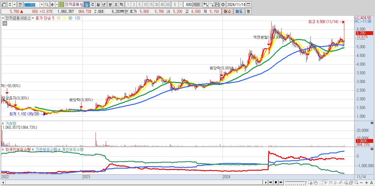- 인카금융서비스 (5,780원 ▲ 12.67% , 시총: 2,970억, 거래량: 1,060,357, 거래대금:63억)