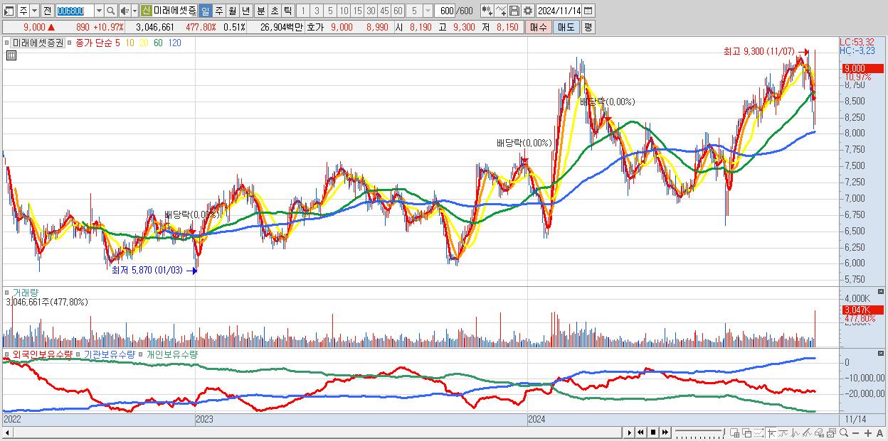 - 미래에셋증권 (9,000원 ▲ 10.97% , 시총: 53,578억, 거래량: 3,046,661, 거래대금:269억)
