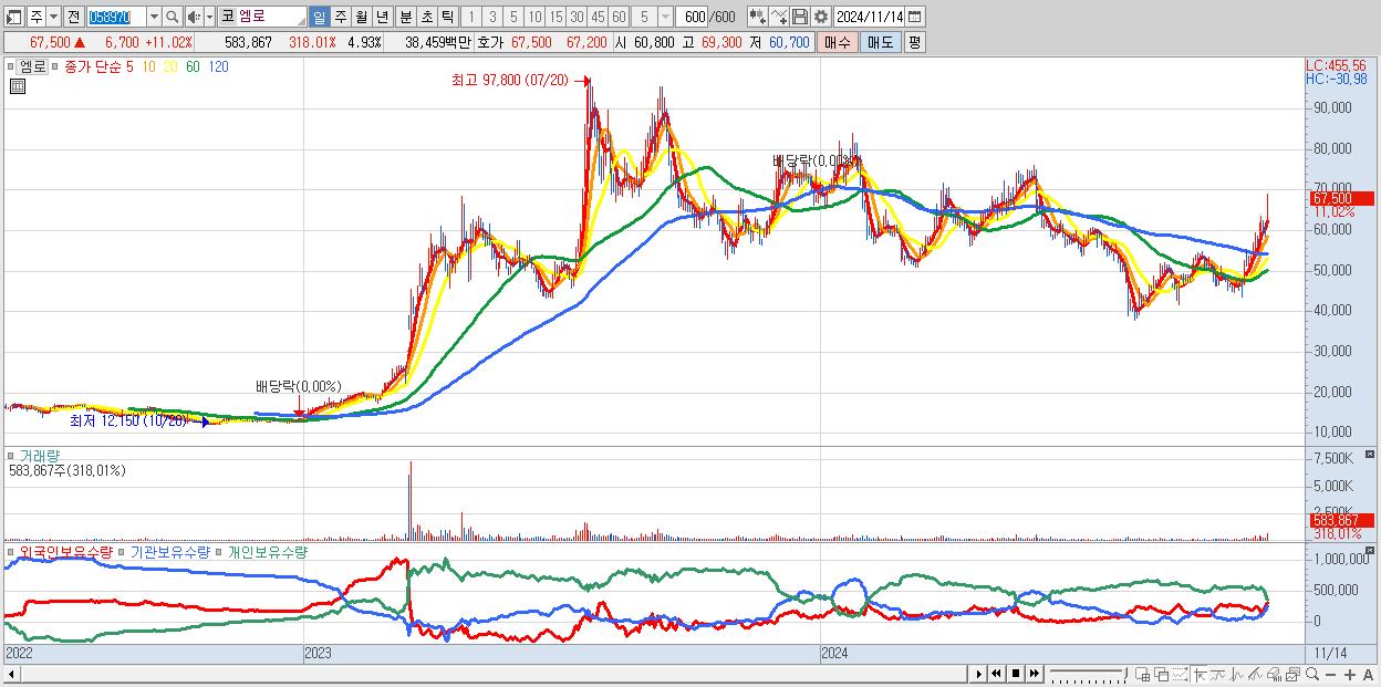 - 엠로 (67,500원 ▲ 11.02% , 시총: 8,001억, 거래량: 583,867, 거래대금:385억)