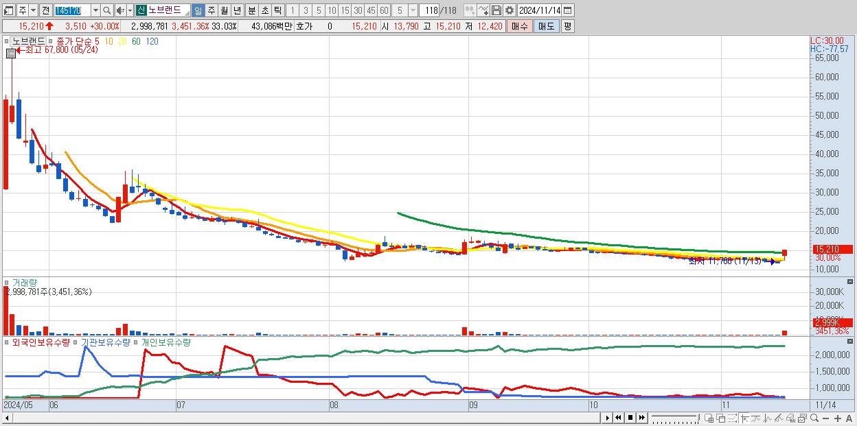 - 노브랜드 (15,210원 ▲ 30% , 시총: 1,381억, 거래량: 2,998,781, 거래대금:431억)