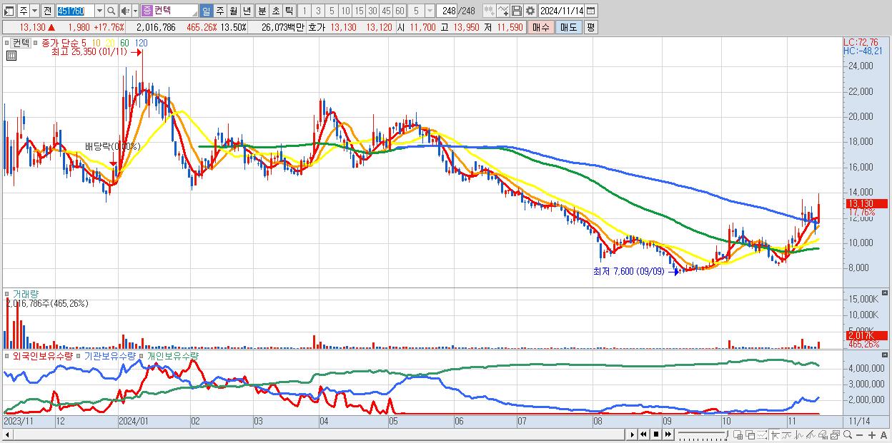 - 컨텍 (13,130원 ▲ 17.76% , 시총: 1,962억, 거래량: 2,016,786, 거래대금:261억)